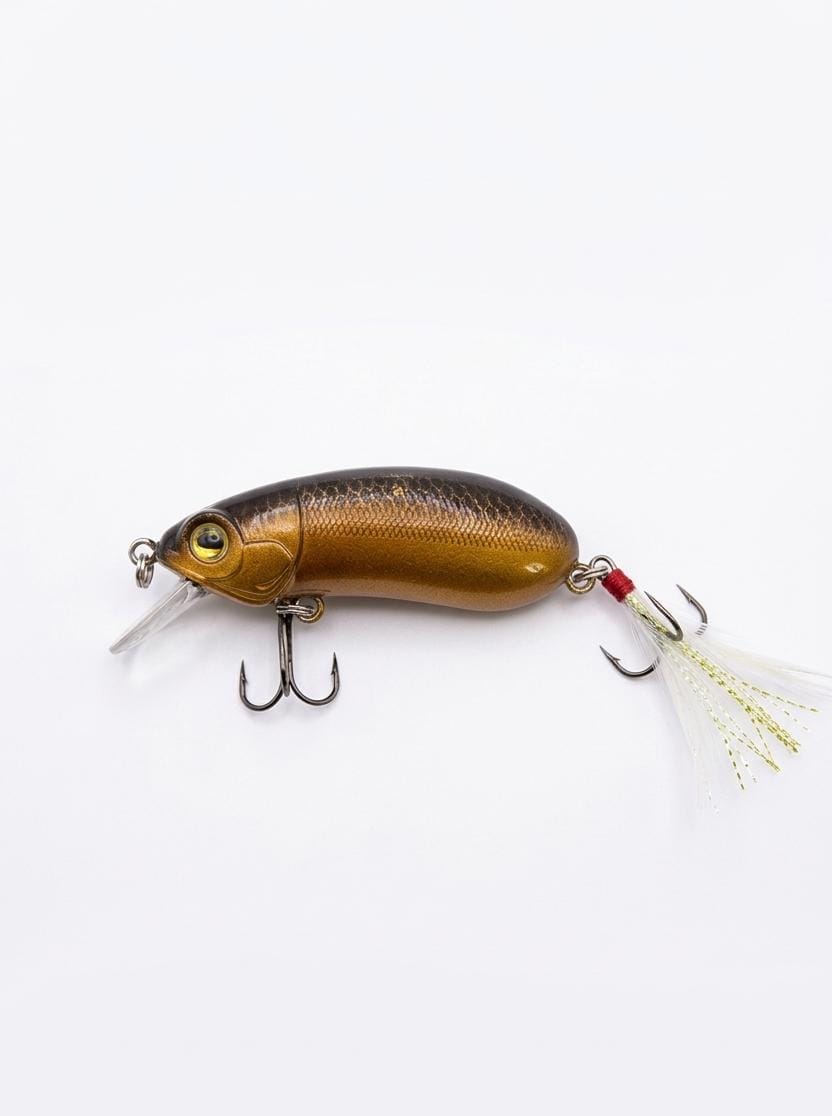 Isca artificial de pesca (crankbait) orpo arredondado para nado vibrante, barbela na frente para mergulho e garatéias com penacho na parte traseira, projetada para atrair peixes predadores através de vibração e movimento subaquático, com 7cm com 12g.