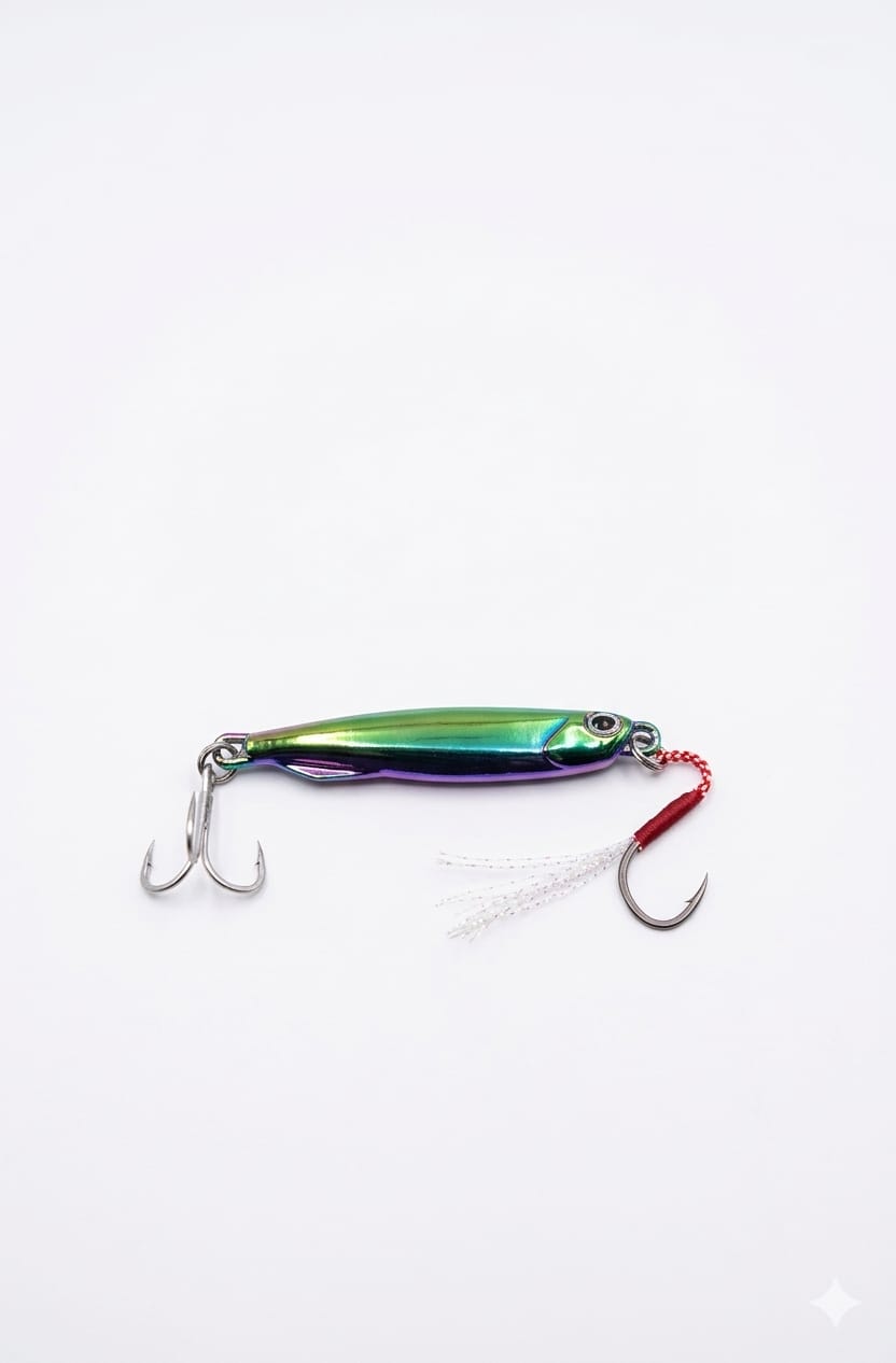Utilizada na técnica de "jigging", simulando um peixe pequeno para atrair predadores, corpo metálico com pintura reflexiva e anzóis nas extremidades (garatéia na cauda e assist hook na cabeça, pode ser trabalhada na vertical ou horizontal, afundando rapidamente para alcançar peixes em diferentes profundidades, com 6,5cm de 22g.