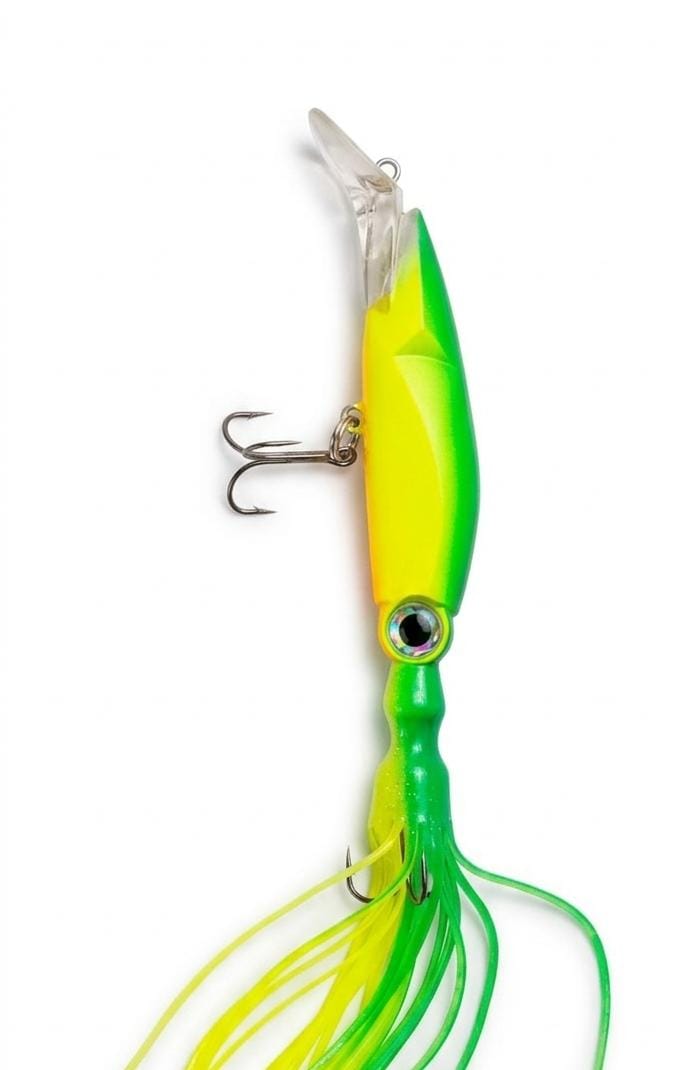 Isca dura de lula projetada para pesca no mar, ideal para captura de atum, cavala e outros peixes grandes, corpo em plástico rígido com tentáculos de silicone, olhos 3D e garateias reforçadas, funciona como isca de meia-água ou para corrico em alto mar, com 14cm e 40g.