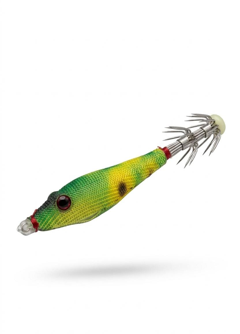 Isca tipo lula com corpo em tecido e coroa de anzóis múltiplos. Ideal para pesca de lulas e polvos. Também pode atrair robalo e badejo em água salgada.