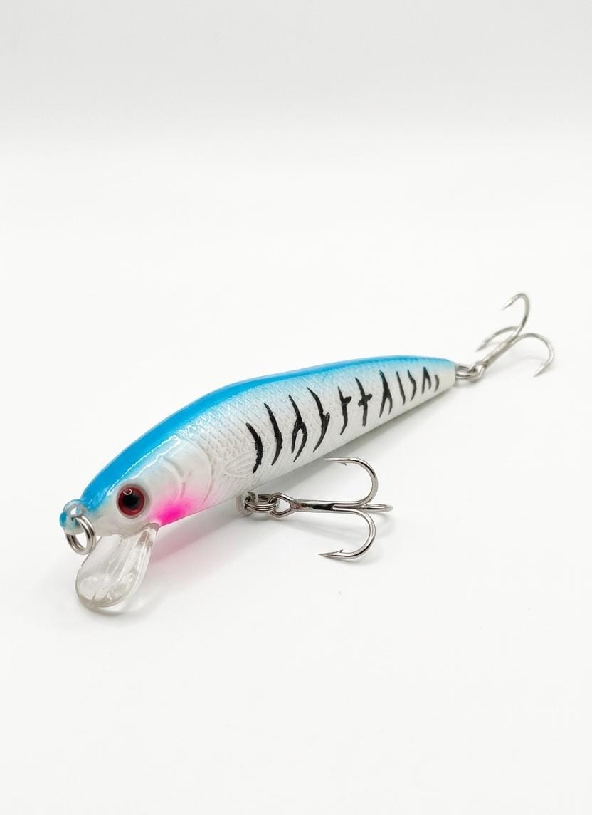 Isca artificial que simula um peixe em fuga ou ferido para atrair predadores, com sistema sonoro interno, aproximadamente 10cm com 10g.