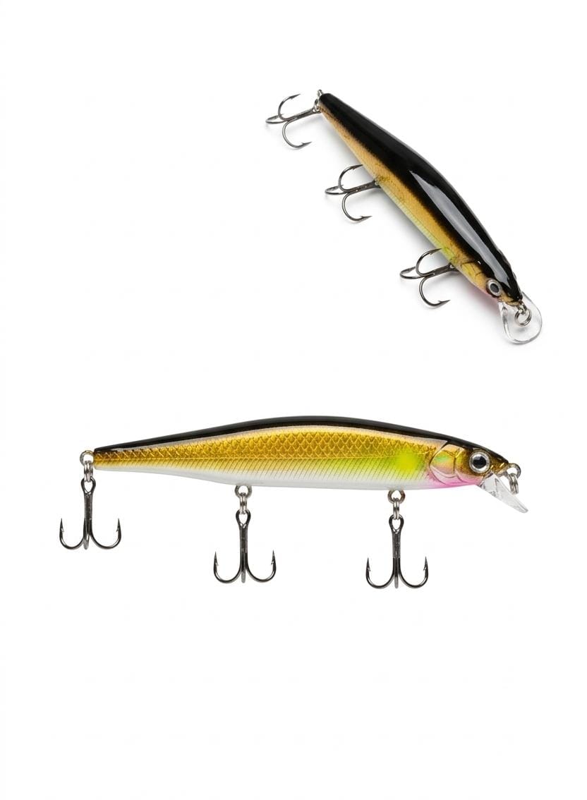 Isca com olhos 3D e detalhes gravados a laser, a isca imita um peixinho real, atraindo peixes com sua aparência realista, projetado como um jerkbait de afundamento lento, permite uma ação de natação natural que estimula ataques de peixes, com aproximadamente 11cm e com 14g.